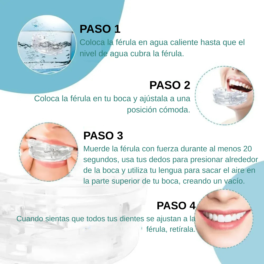 El dispositivo está fabricado con un material de silicona suave y flexible que se adapta a la forma de tu boca. Las instrucciones de uso te guían para que lo sumerjas en agua caliente y lo muerdas, creando un molde personalizado de tus dientes. Es normal sentir una ligera presión al principio, pero esto desaparece después de un par de noches.